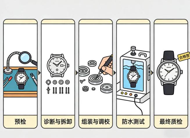 现场环境:装修风格统一、干净整洁,等候区提供茶水服务;维修区采用独立操作工位,避免多块腕表交叉作业造成划痕或零件混淆。